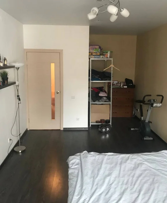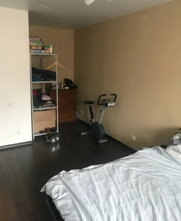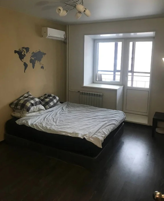 В комнате остается: кондиционер, огромная кровать 2 на 2 метра с ортопедическим матрасом с запоминанием памяти, комод, стеллаж под вещи , настенные полки.